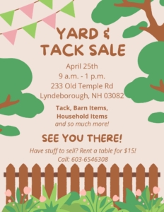 - April 16, 2023, 11 am – 2 pm: Tack Sale!